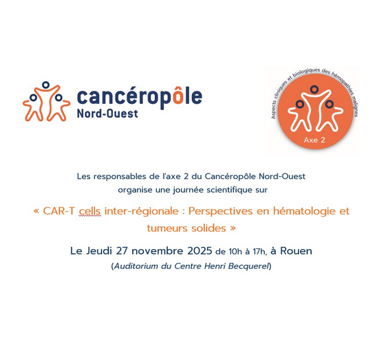 Les responsables de l'axe 2 du cancéropôle Nord-Ouest (CNO) organisent une journée scientifique sur la thématique "CAR-T cells : perspectives en hématologie et tumeurs solides" le jeudi 27 novembre 2025 de 10h à 17h, à l'auditorium du centre Henri Becquerel (Rouen).