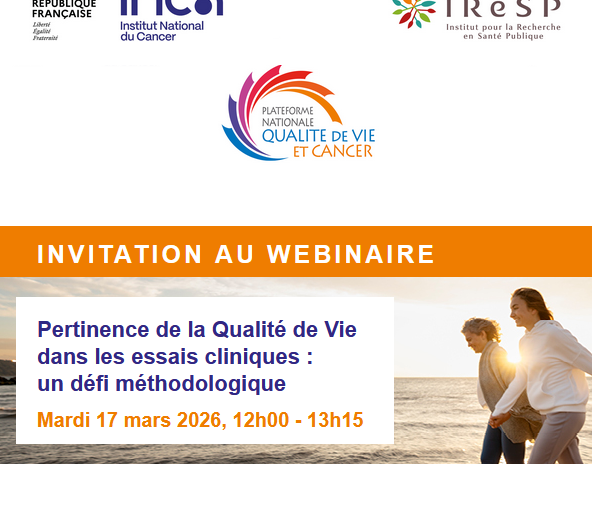 La Plateforme nationale qualité de vie et cancer organise, avec le soutien de l'INCa et de l'IReSP, un webinaire intitulé "Pertinence de la qualité de vie dans les essais cliniques : un défi méthodologique" le mardi 17 mars 2026 de 12h à 13h15 sur la plateforme virtuelle Zoom.