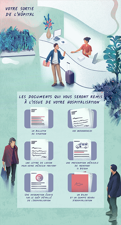 - un bulletin de situation qui indique les dates d’arrivée et de sortie de l’hôpital, nécessaire à la perception de vos indemnités journalières de Sécurité sociale (ce document vaut arrêt de travail pour justifier de votre absence auprès de votre employeur)