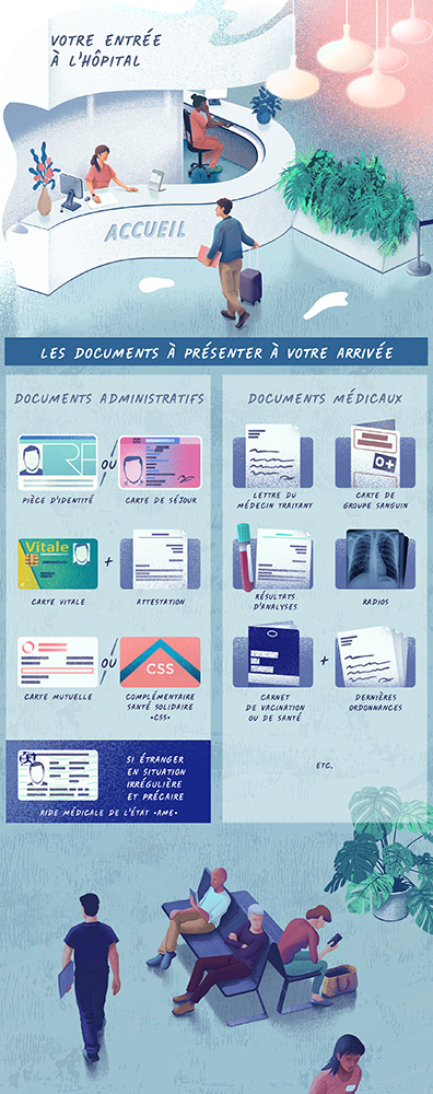 À votre arrivée à l’hôpital, vous devez vous présenter au bureau des entrées ou des admissions avec les documents administratifs nécessaires à votre prise en charge :